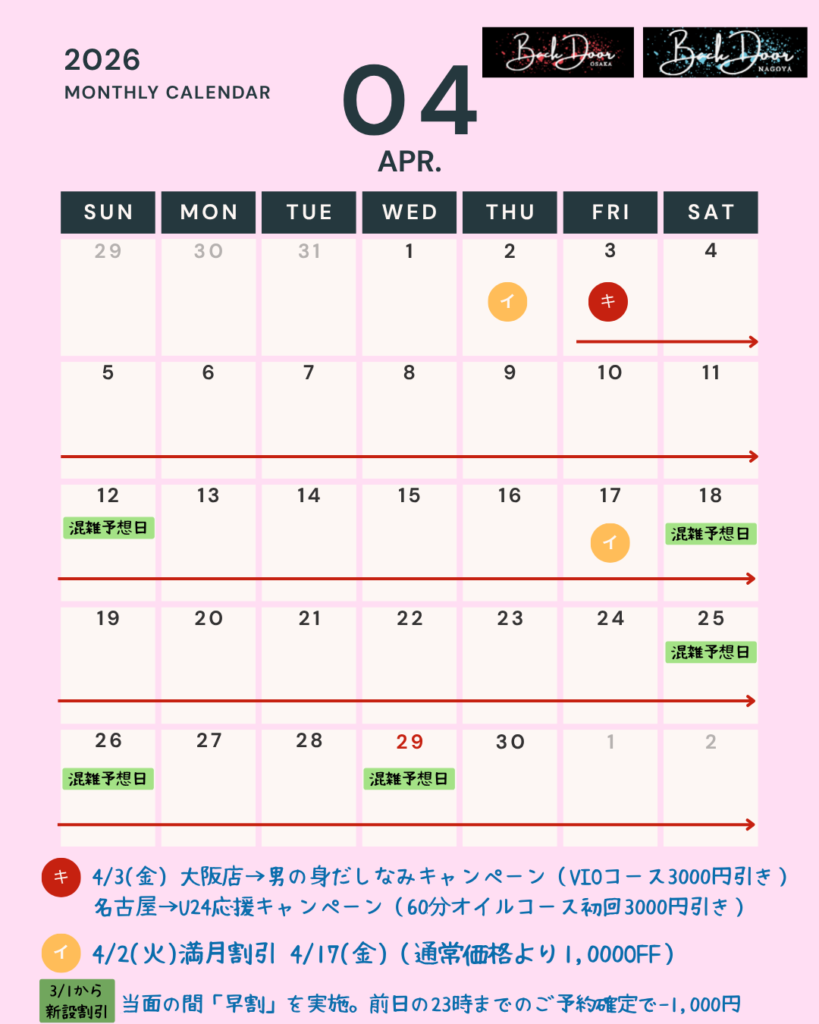 お知らせ2026.04.03【バックドア大阪】2026年4月のスケジュール